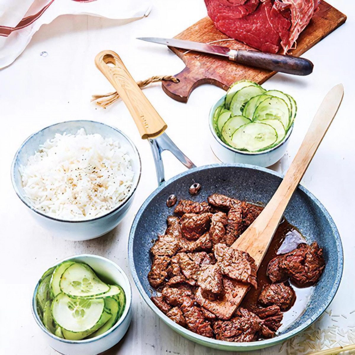 Bœuf mariné citronnelle riz basmati et salade concombre