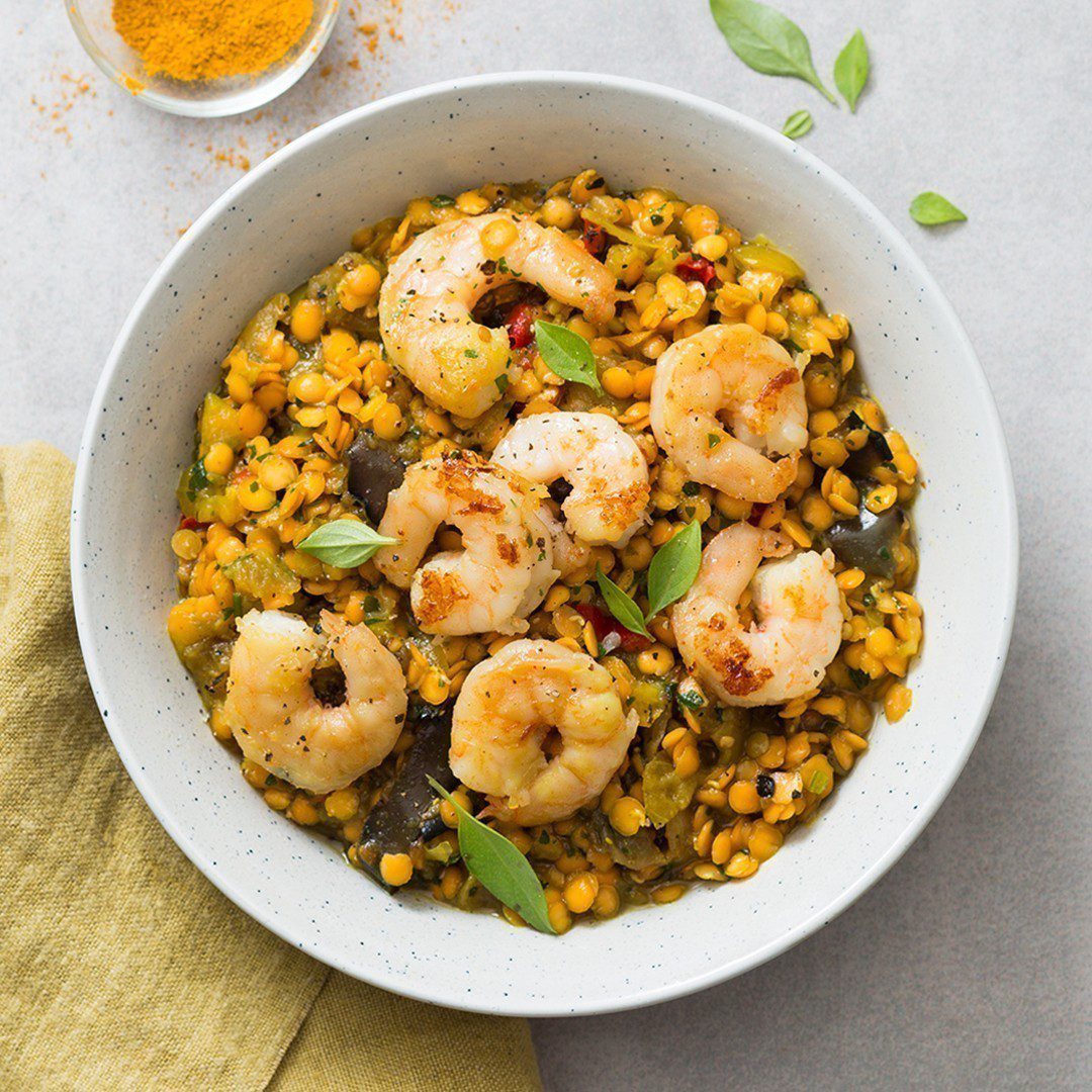 Gambas et son dhal de lentilles corail et aubergines au curry jaune