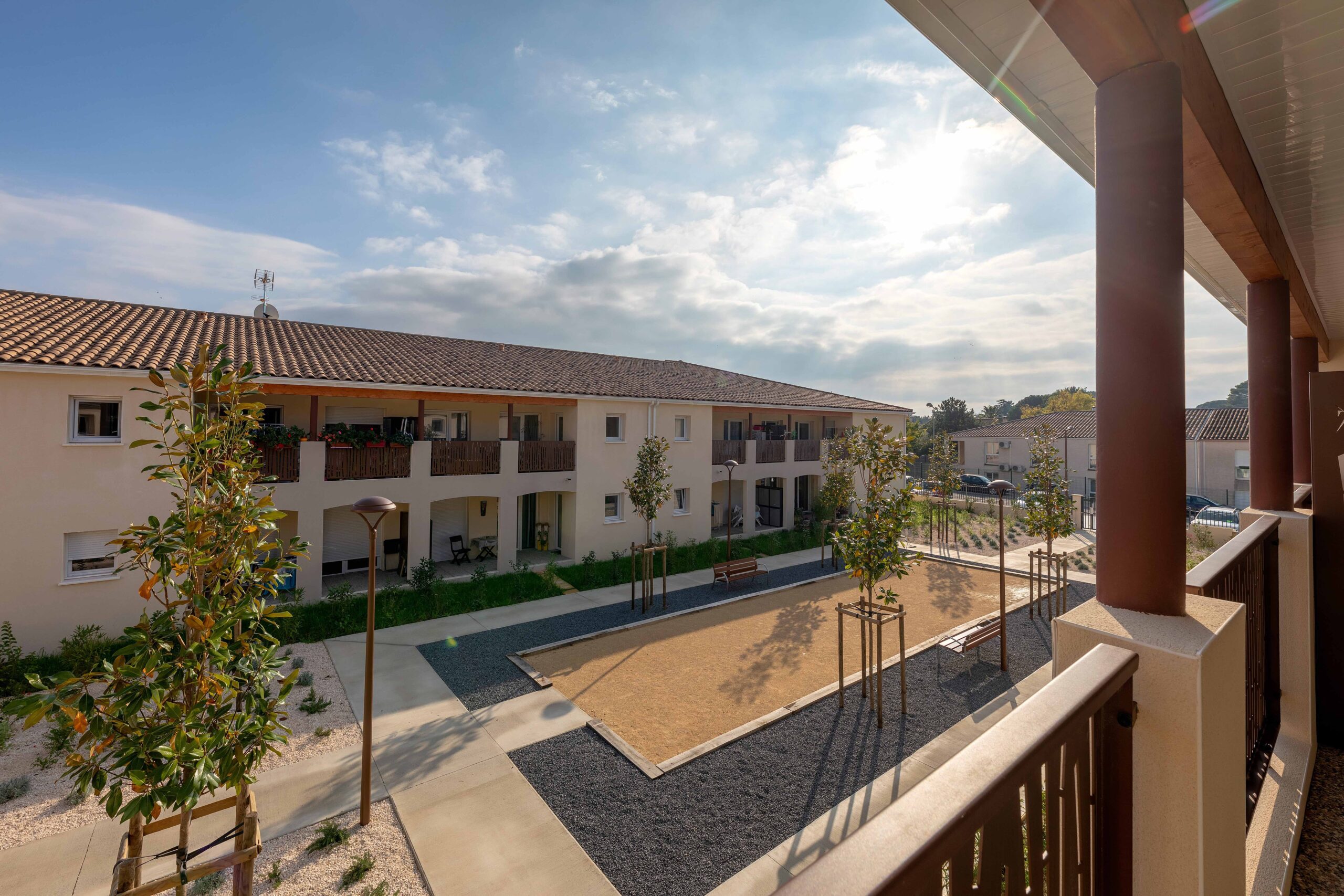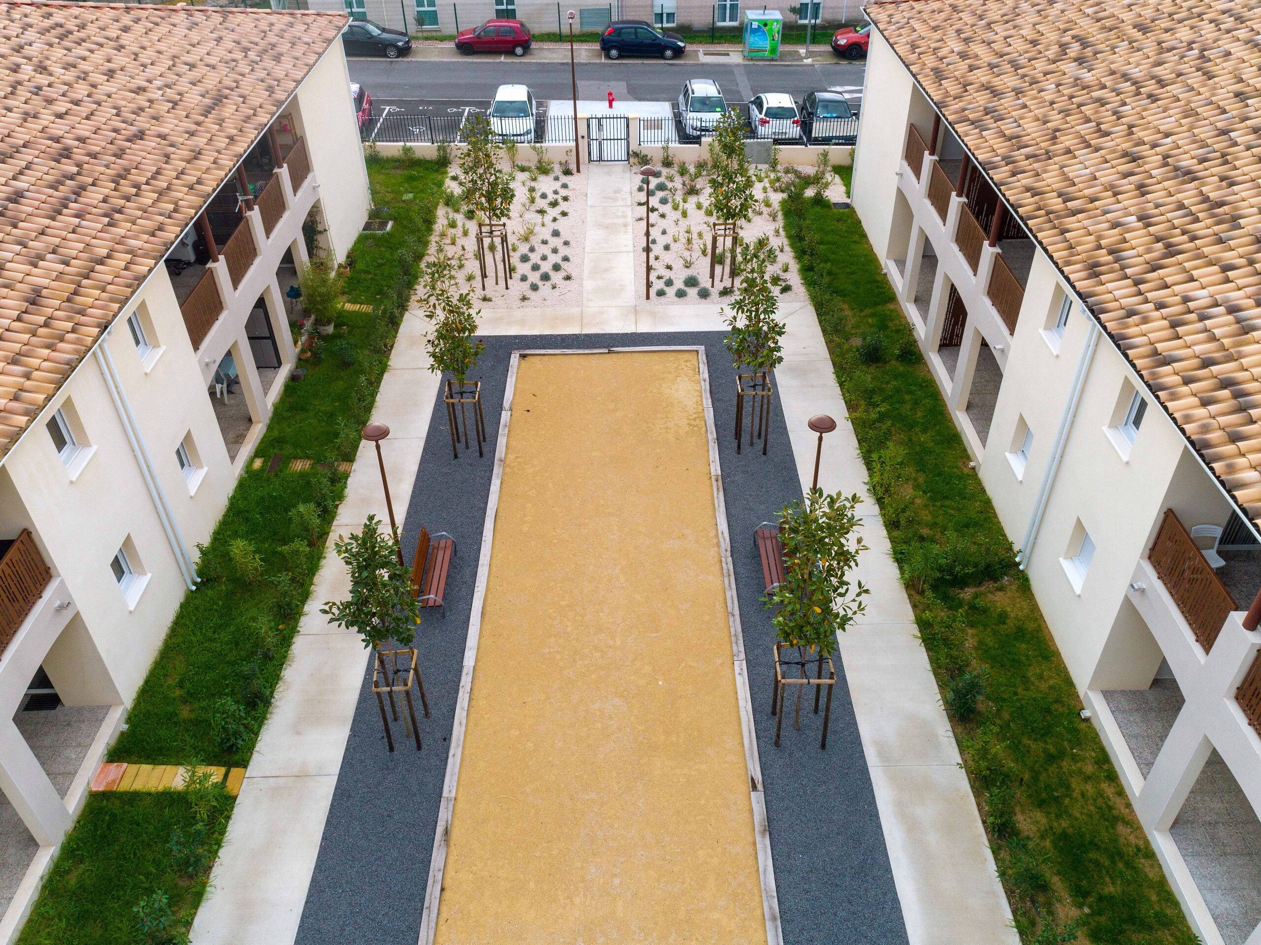 La résidence s’organise autour du club-house, implanté au centre et dont la terrasse s’ouvre sur un mail piétonnier central doté d’un boulodrome.