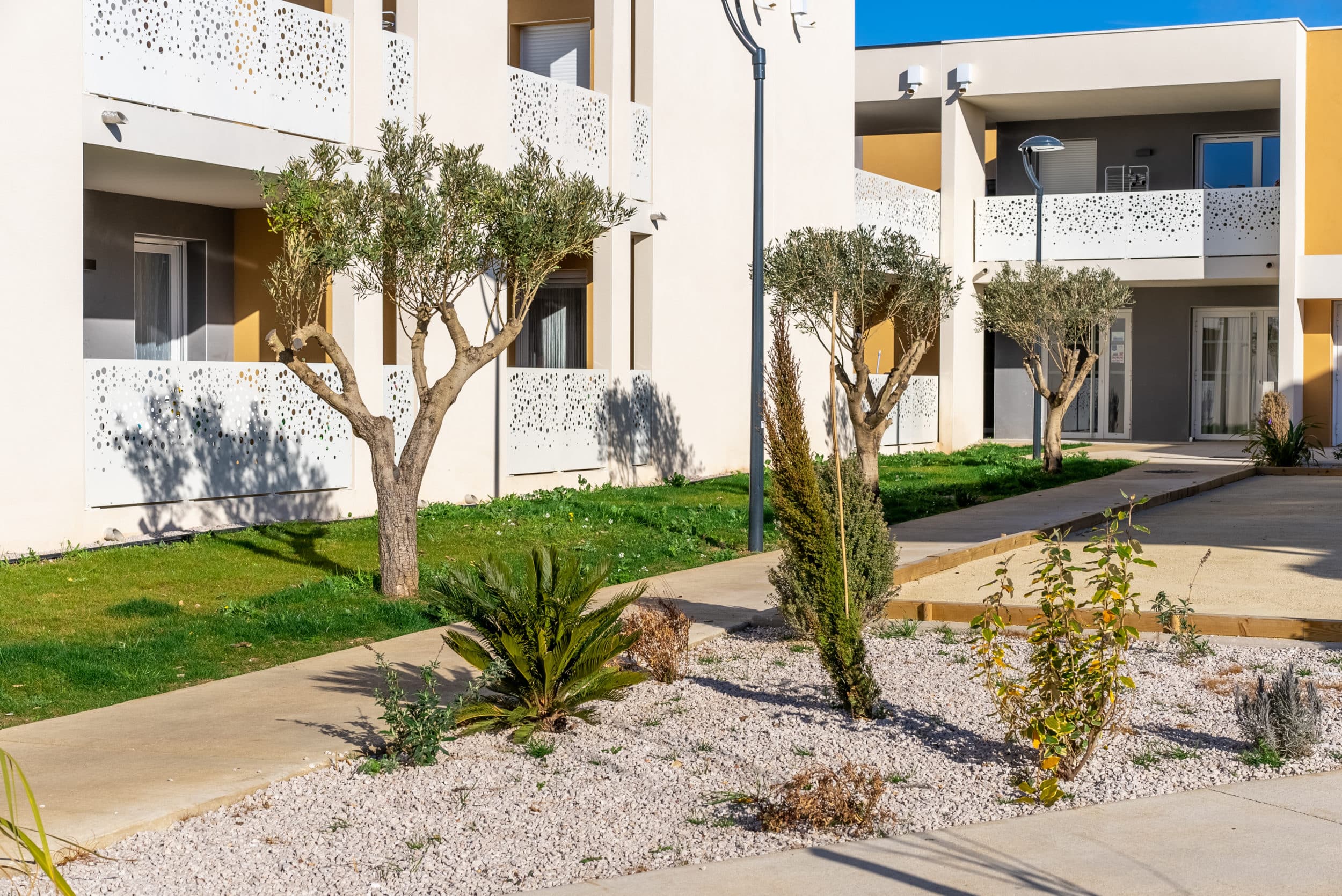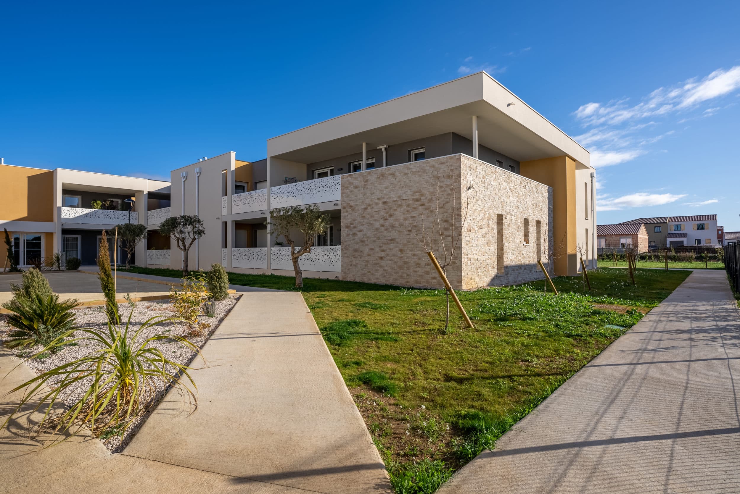 Située au coeur du village de Pömerols connu pour ses vignes, la résidence propose 66 logements de deux ou trois pièces spécifiquement pensés pour les seniors. En son centre, on retrouve le club-house dont la terrasse s’ouvre sur le boulodrome central.