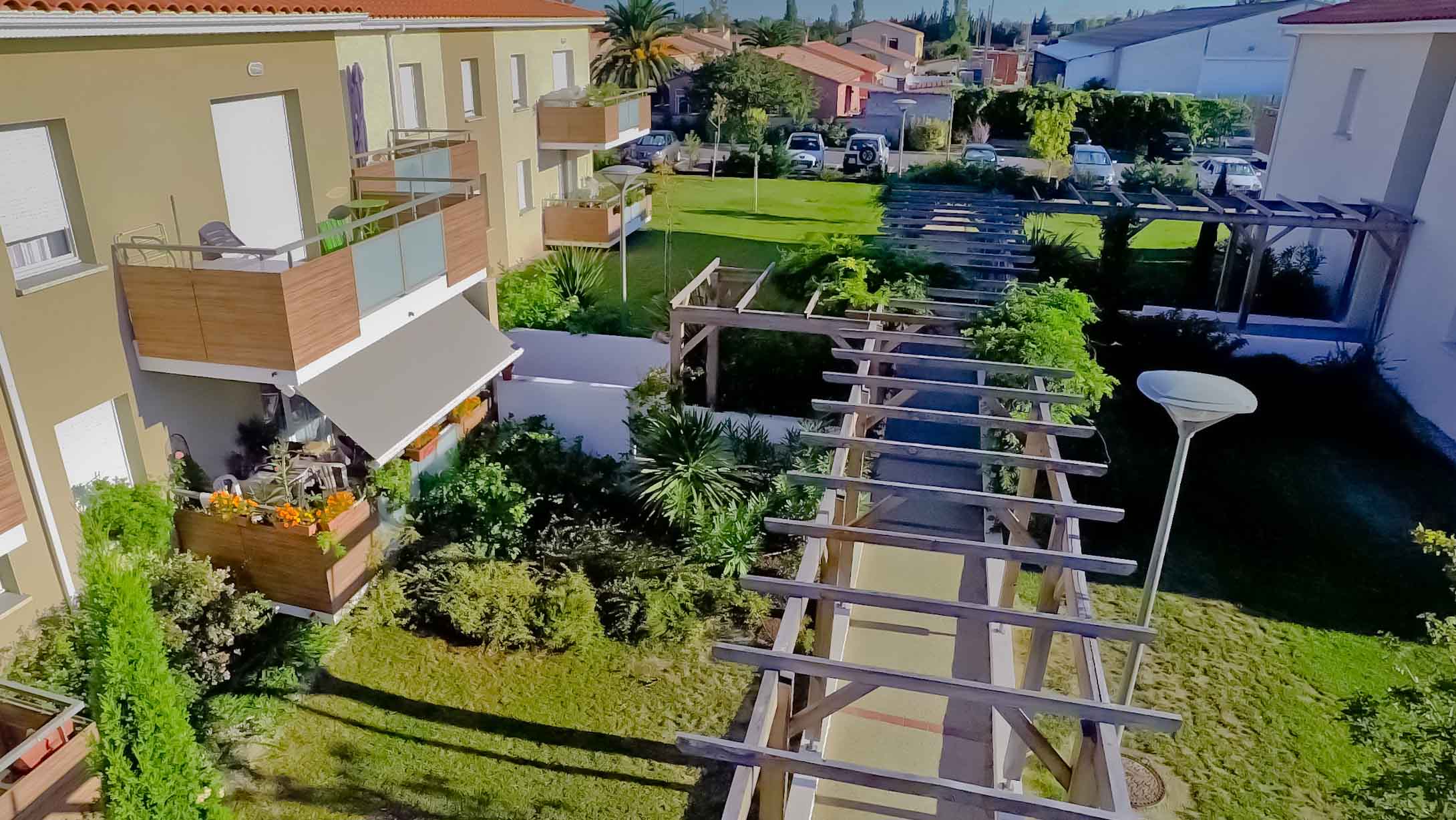Composée de 3 bâtiments de 2 niveaux seulement, la résidence affiche une architecture typiquement méditerranéenne et bénéficie d’une belle exposition plein sud.