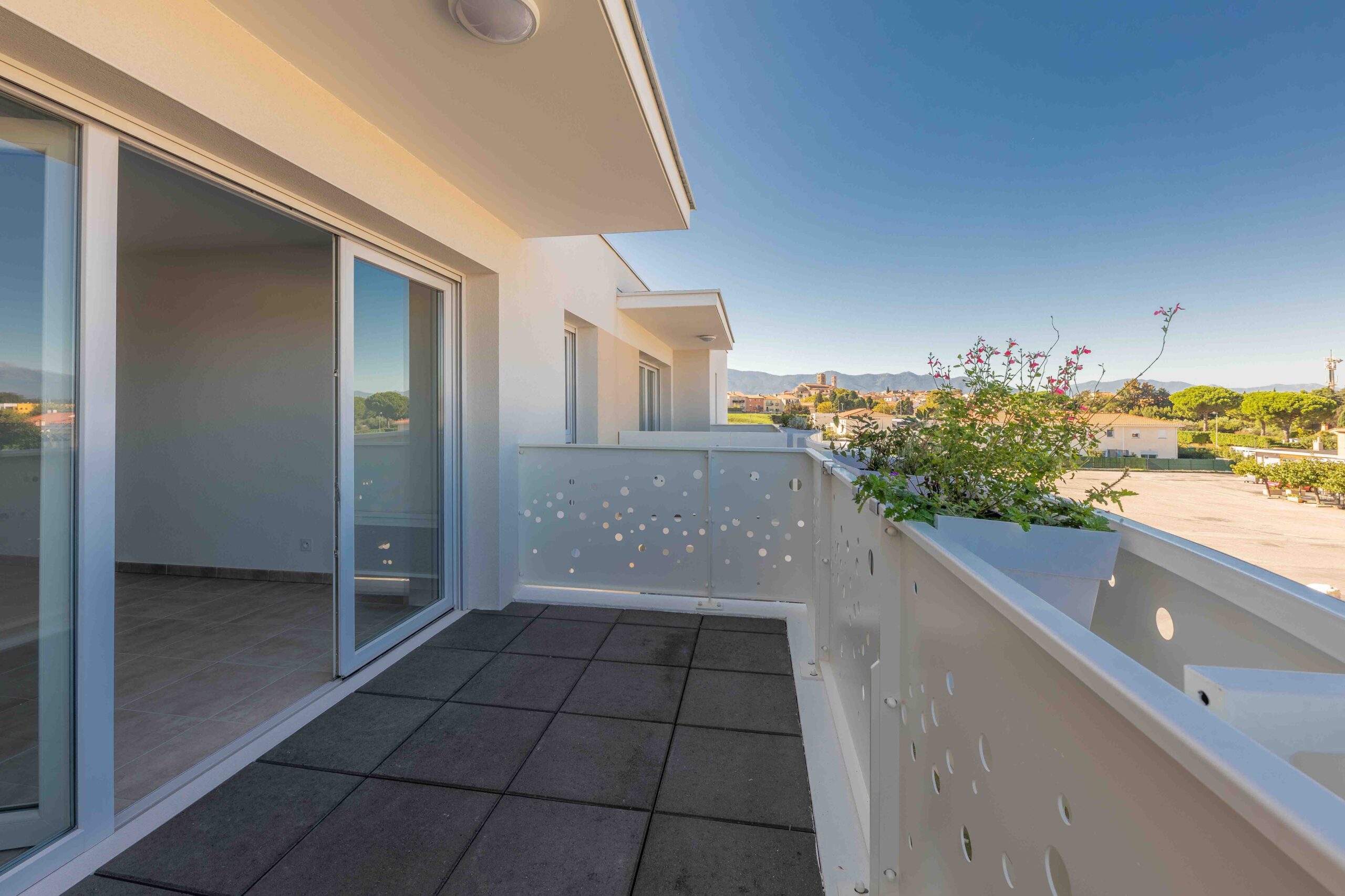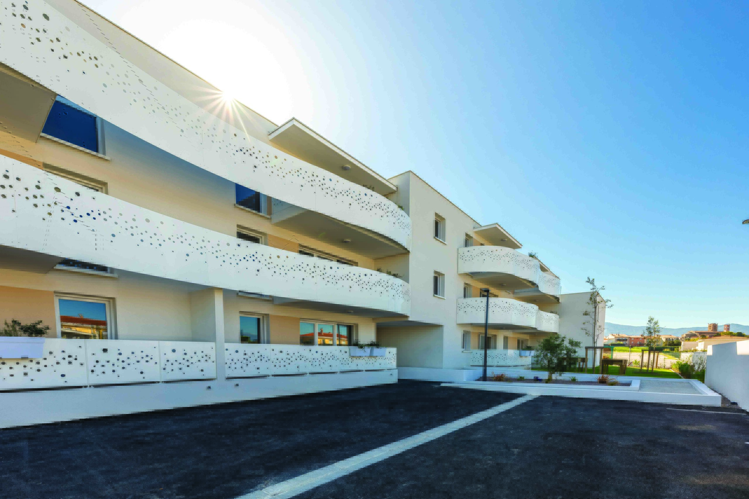 Pour une parfaite intégration dans le site, le bâtiment, orthogonal et contemporain avec sa toiture plate, présente des angles arrondis et de larges terrasses à garde-corps pleins et courbes rappelant la nature environnante.
