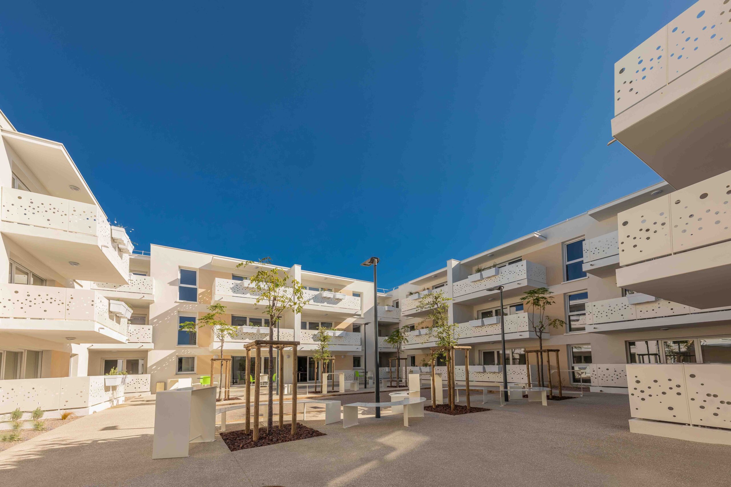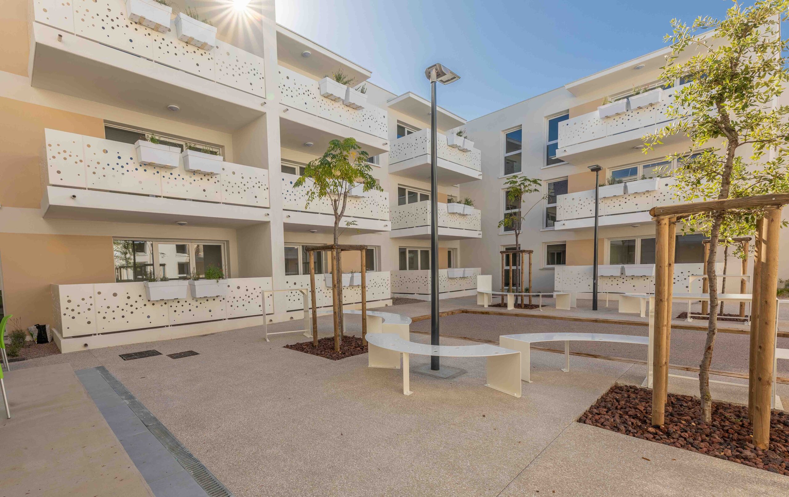 Organisé en forme de U inversé, le bâtiment s’articule autour d’un patio central qui offre ainsi un lieu de vie et de détente abrité pour plus d’intimité. Ce patio est aménagé de façon à participer à la vie en communauté des usagers : banc à la Gaudí, terrasse en bois, circulation en revêtement minéral, végétation méditerranéenne…